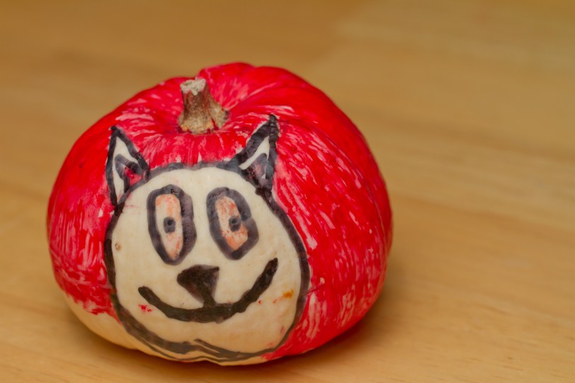Here’s a little fella left over from Halloween, isolated from his two other squash/pumpkin buddies who survived the season! Cait and Kaylea had fun this year colouring them but it would appear that they neglected to complete the colour job on this poor dude! Enjoy…
