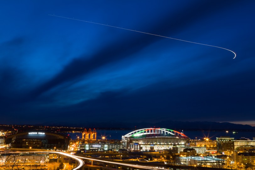 My work has this “rewards” program where occasionally you can load a visa card with some cash! Well, I haven’t spend any of mine for SOME time and decided to head down to Seattle today to get a new tripod with said funds! Wooooot! This is a shot of Qwest field (mainly (American) football) on the right and Safeco Field (baseball) to the left. I just happened to press the shutter when there was a plane flying by, I rather like the trail! Enjoy…