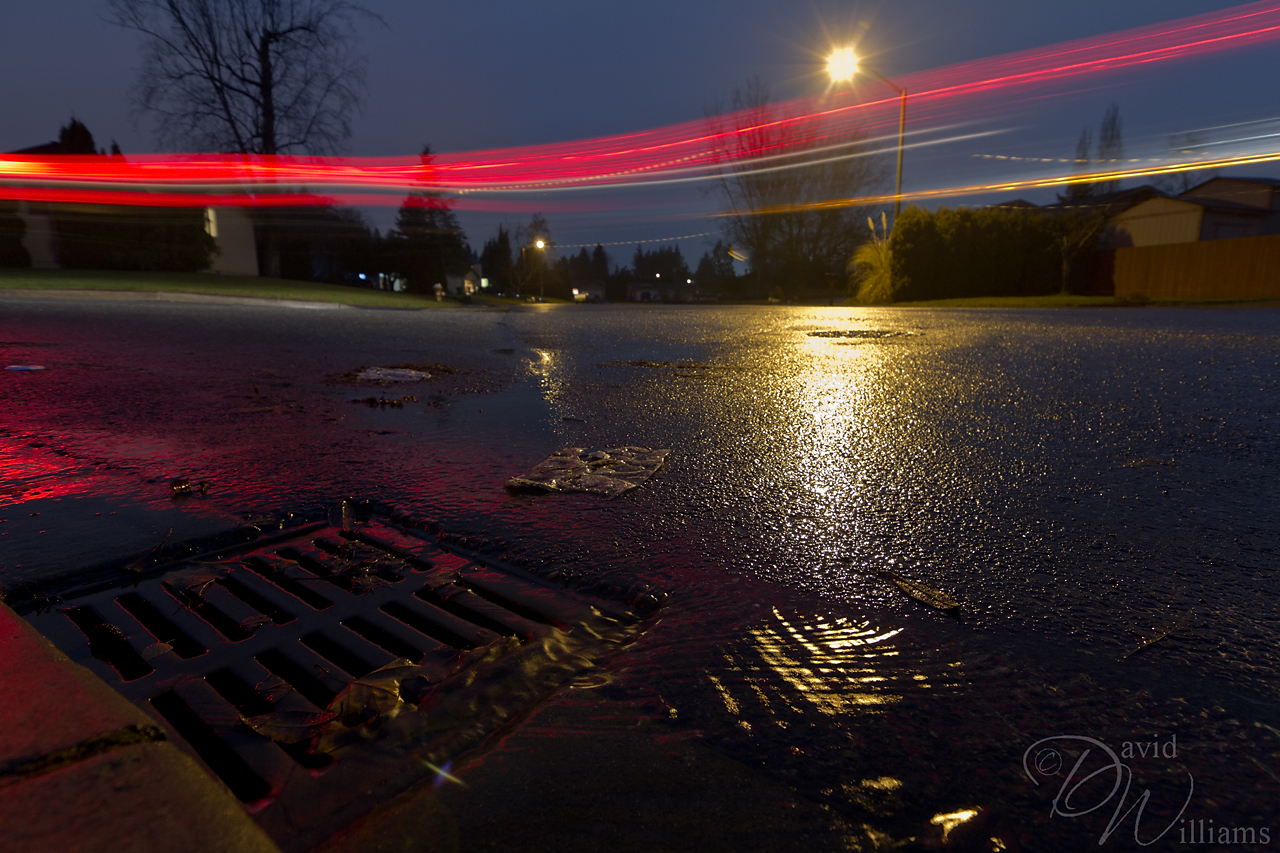 I knew I would somehow use my wide angle lens in today’s shot, just didn’t know what the shot would be! It’s (still) been nasty weather wise here (rain and rain and…more rain) but I was determined to get this shot. So there I was, on the corner of our street (under my umbrella of course) waiting patiently for a car (or two) to go by and they just were not cooperating with me (silly cars). So what do I do? Ask Amy to hop in the car and drive around the block a few times.