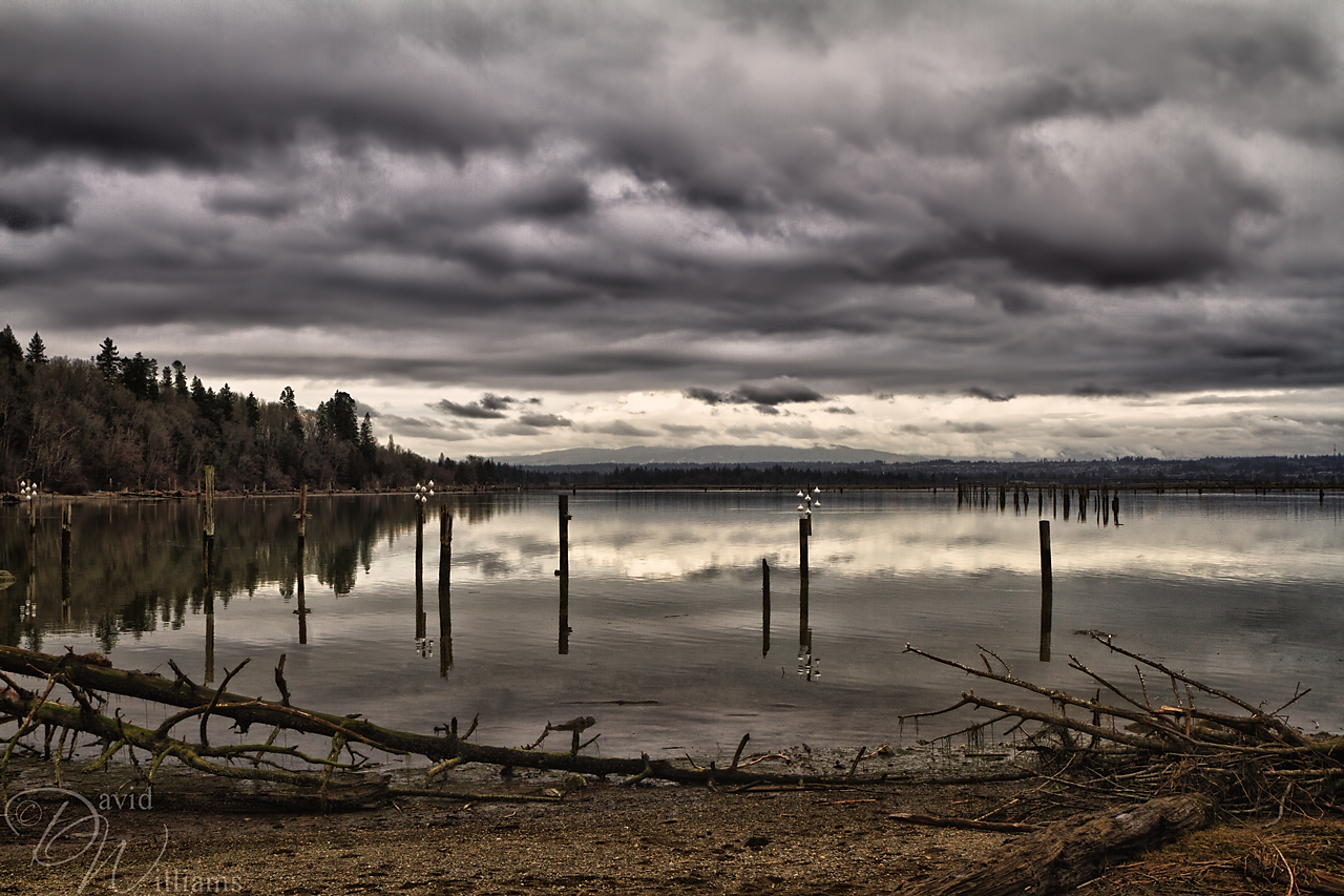 I’ve never seen The Twilight Zone–but this picture sure fits the title alone. There’s just so much ‘atmosphere’ to it–the foreboding cloudcover looming over the lake; and all the prickly driftwood washed up on shore–like a barbed wire barricade–it’s kind of spooky and calming at the same time.