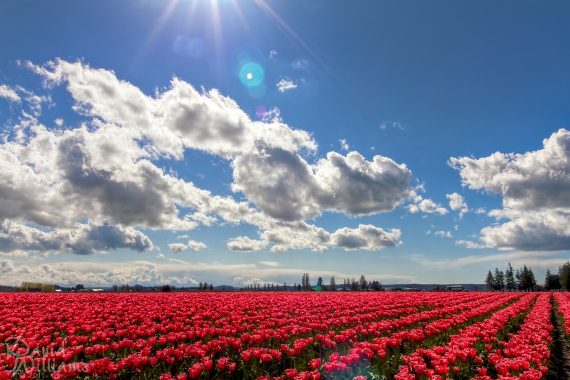 Wow, that’s a lot of tulips! The colour of the sky and the flowers make a striking combination.