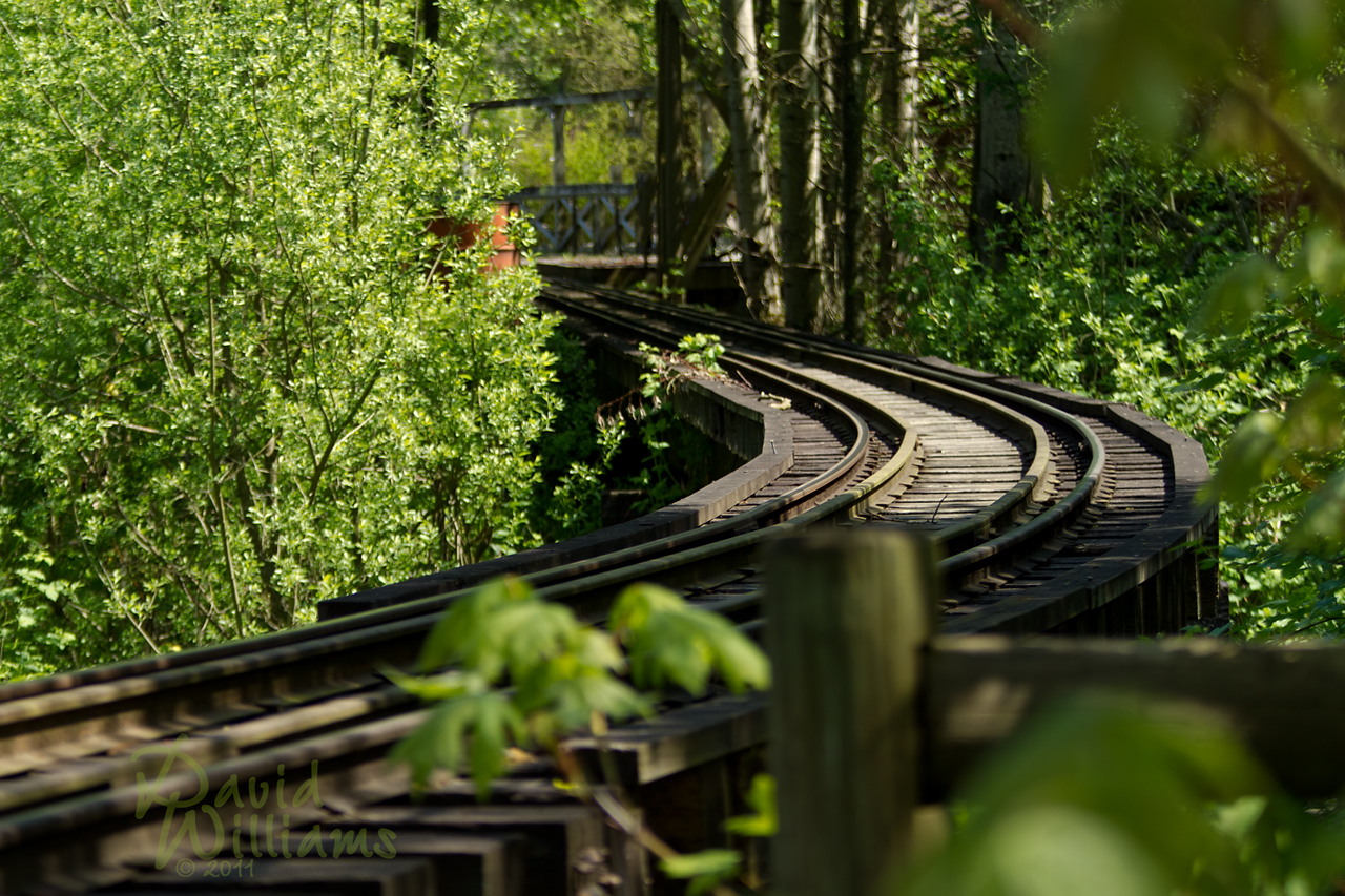 Great shot, I love the curvature of the tracks and the hint of the bridge in the background.