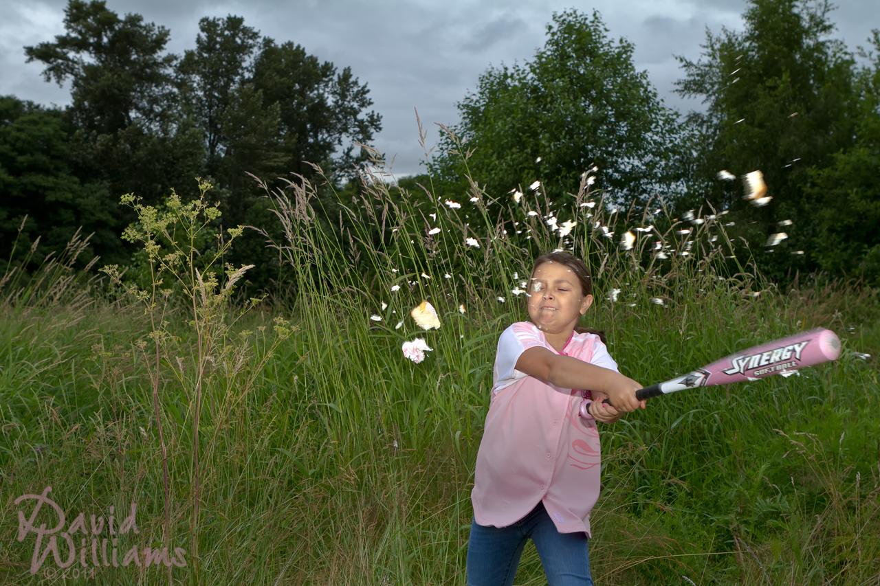 About the shot. I had this in my mind all day, went to the local grocer and picked up a dozen cupcakes and three little little cakes. Now, I don’t know if Cait had issue hitting the things cause they were not a HUGE, neon yellow/green’ish softball but we went through all the cakes without a single hit. Oddly enough, she actually hit the cupcakes (which were much smaller) quite a few times! Ohhh well, enjoy…